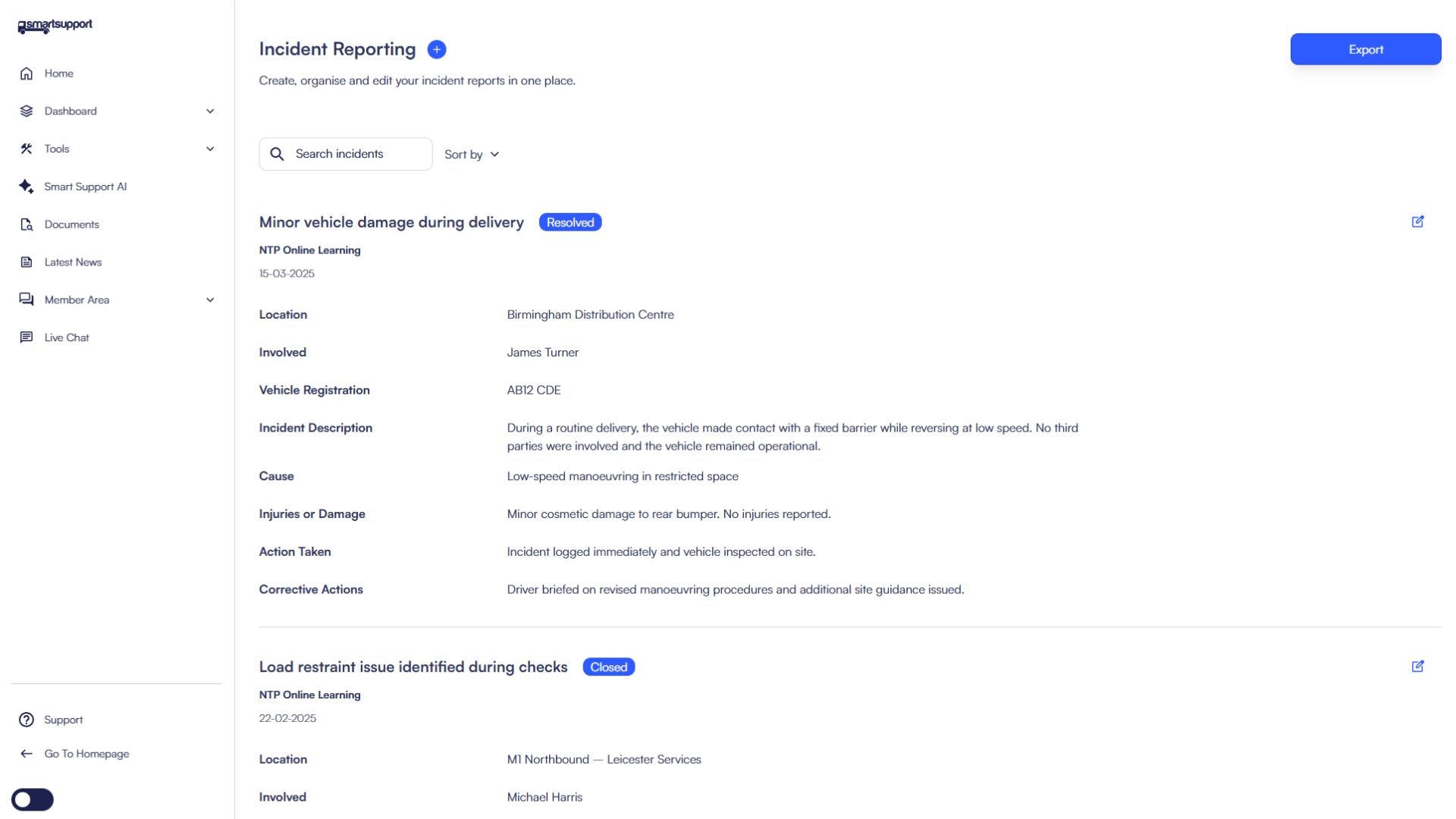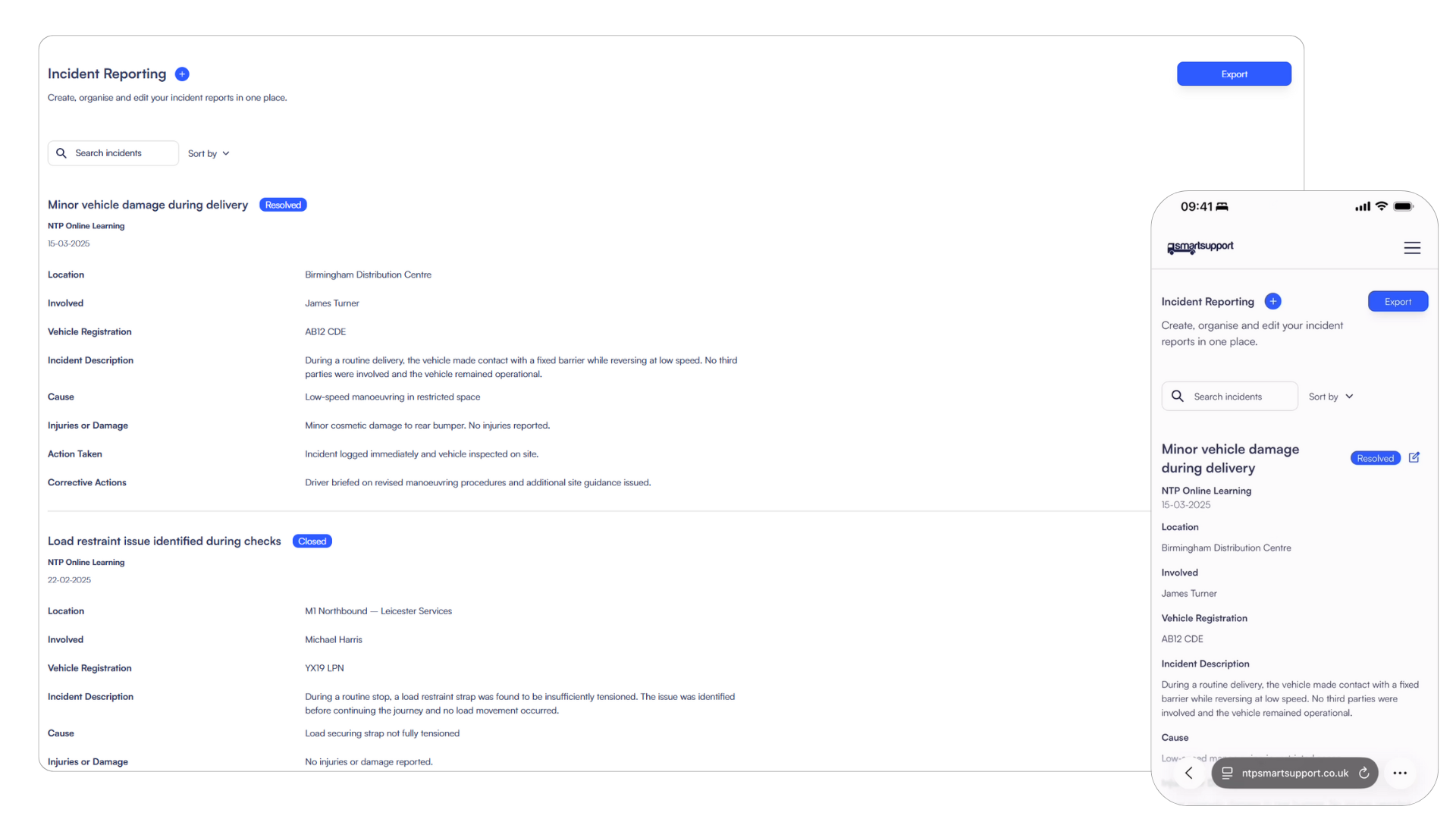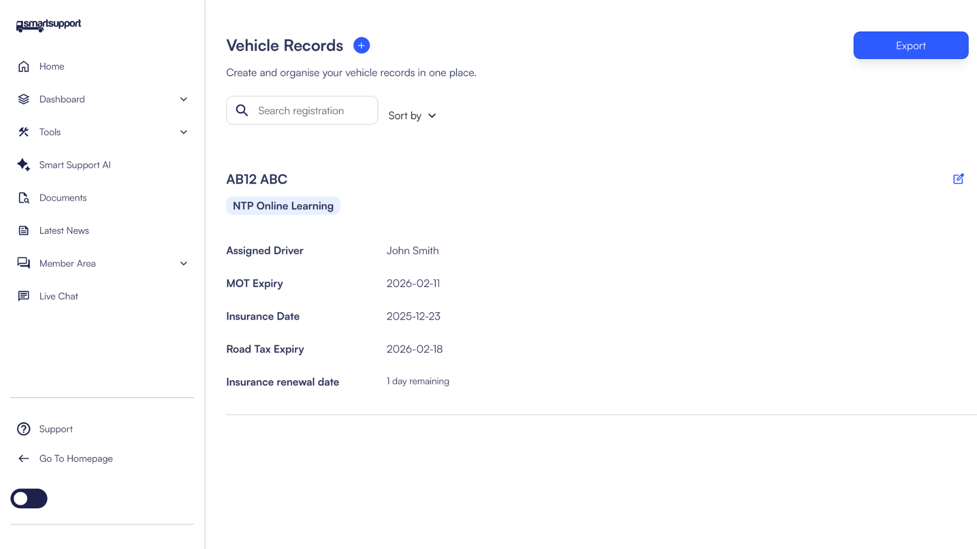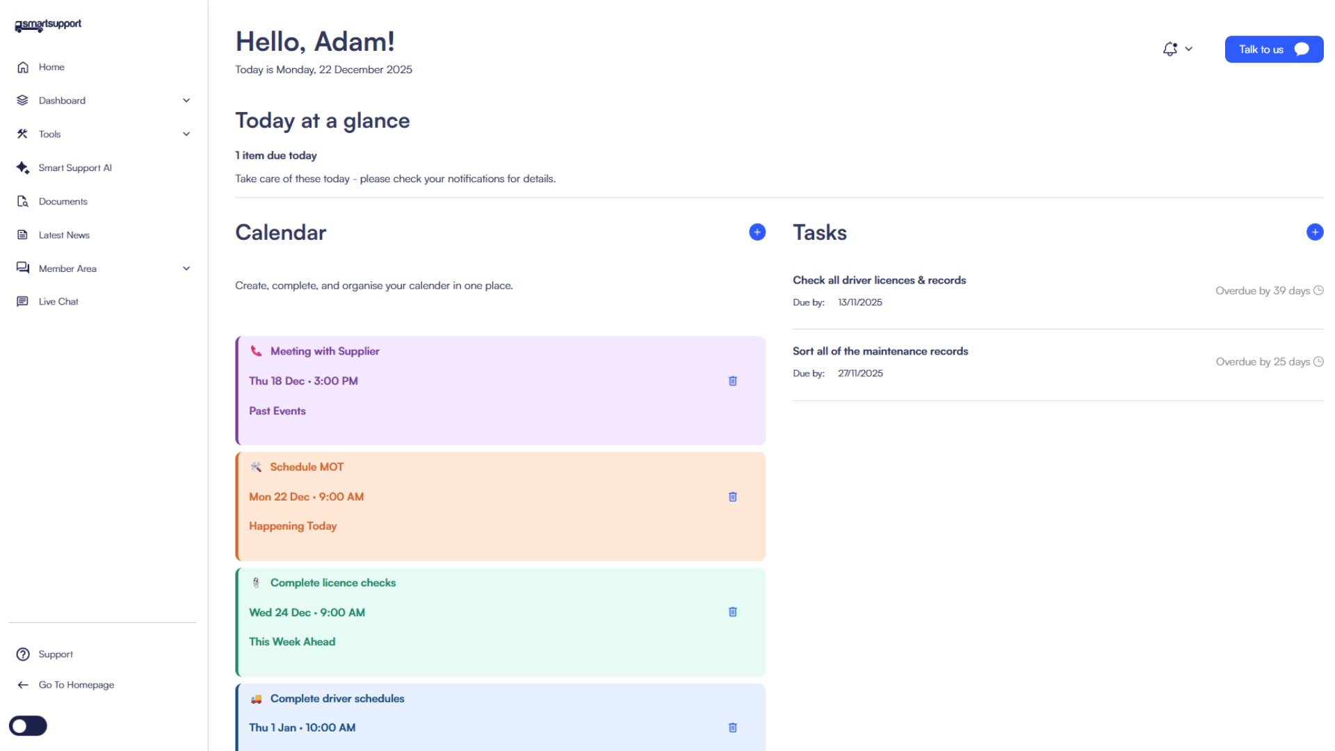 Smart Support puts your entire transport operation into one clear dashboard. Organise companies, drivers, vehicles, tasks and records so nothing gets missed and your day stays under control.